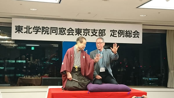 本年のイベントは、第一部は、三枡家小勝師匠に軽妙な落語「源平合戦」を演じていただきましたが、途中から当日出席者最高齢の佐藤暢男様も高座にあがり、盛り上がりました。