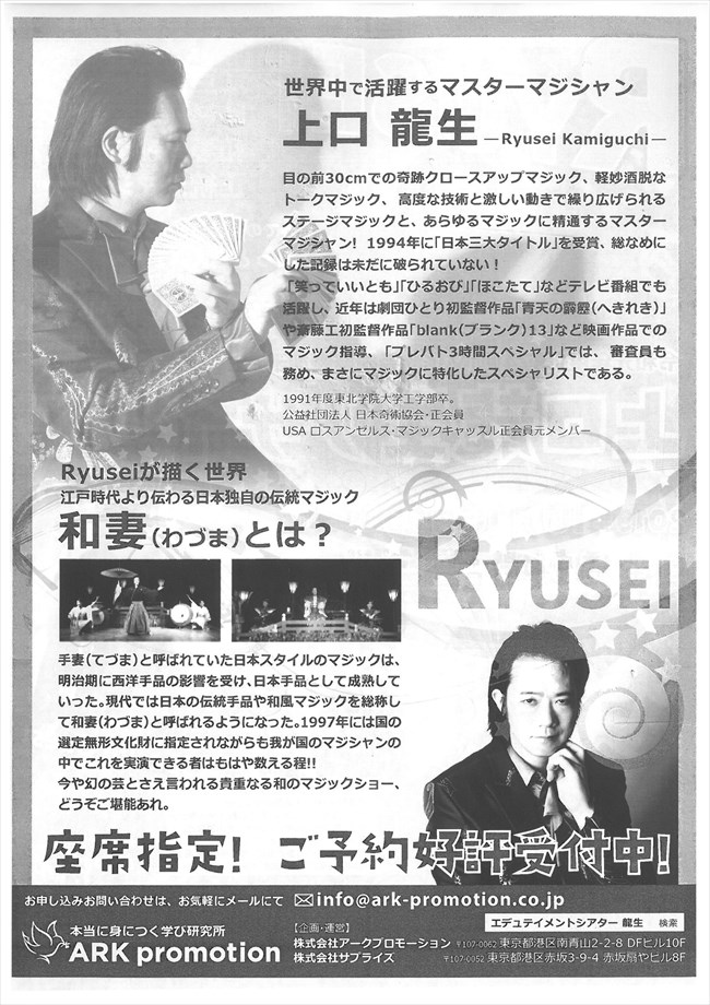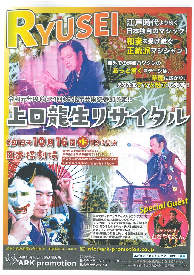 記 日時 2019年10月16日(水) 開演 19時 会場 日本橋劇場 東京都中央区日本橋蛎殻町1-31-1 前売指定席S 6,000円 前売指定席A 5,500円 当日自由席 5,500円(但し、空きがある場合のみ) お申込み・お問い合わせは上口龍生さんに直接、お電話願います。 電話番号090-3426-1051 「東北学院同窓会東京支部のホームページ見た」と言ってください。