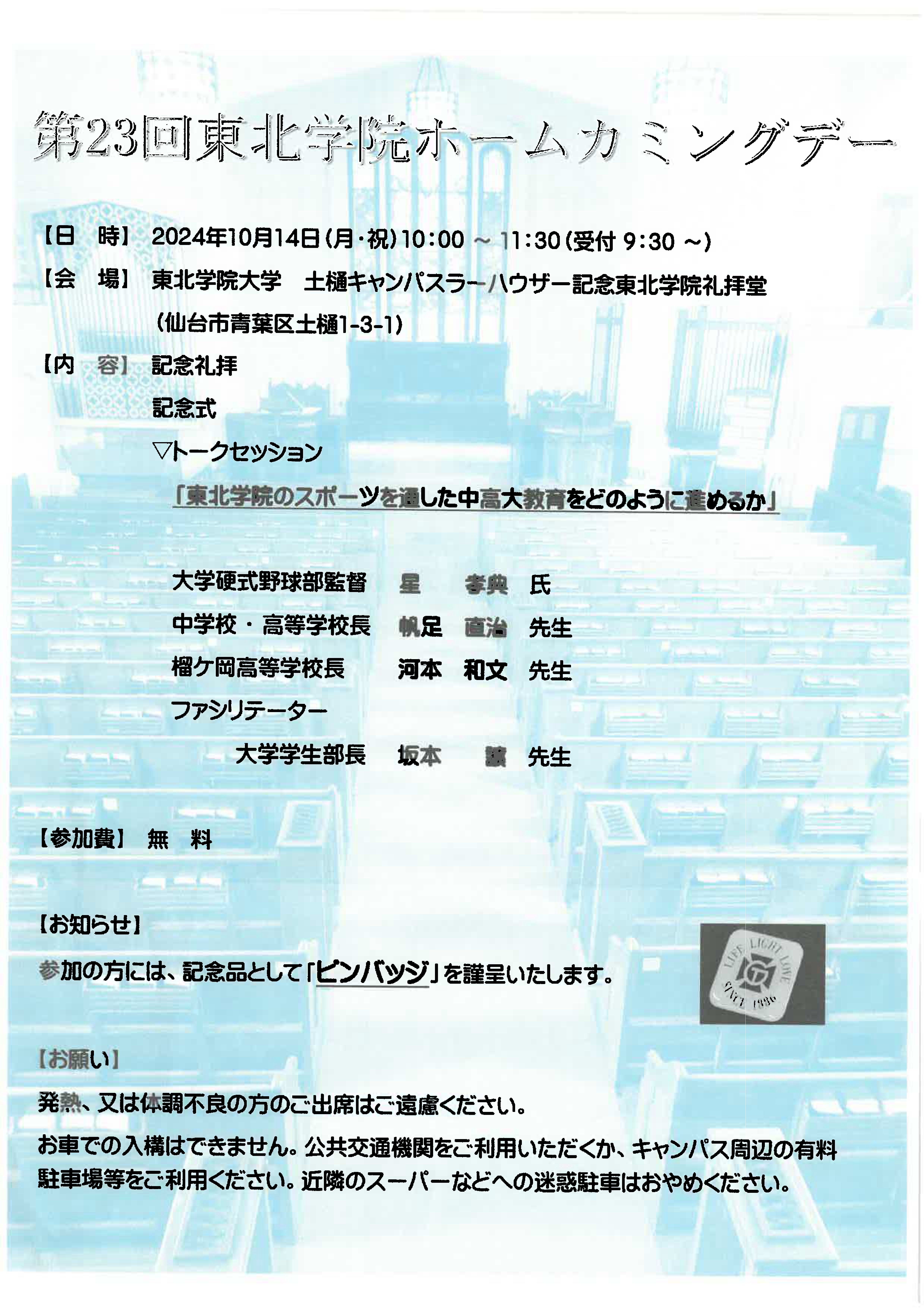 ※ホームカミングデー参加された方には、記念品として「ピンバッジ」を謹呈いたします。